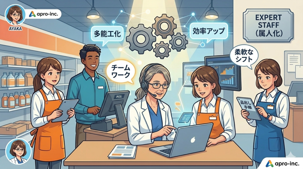 一人が一つの専門業務しかできない状態から、全員が複数の業務をこなせる**「多能工化」**が進むと、現場のレジリエンス(適応力)は飛躍的に高まります。