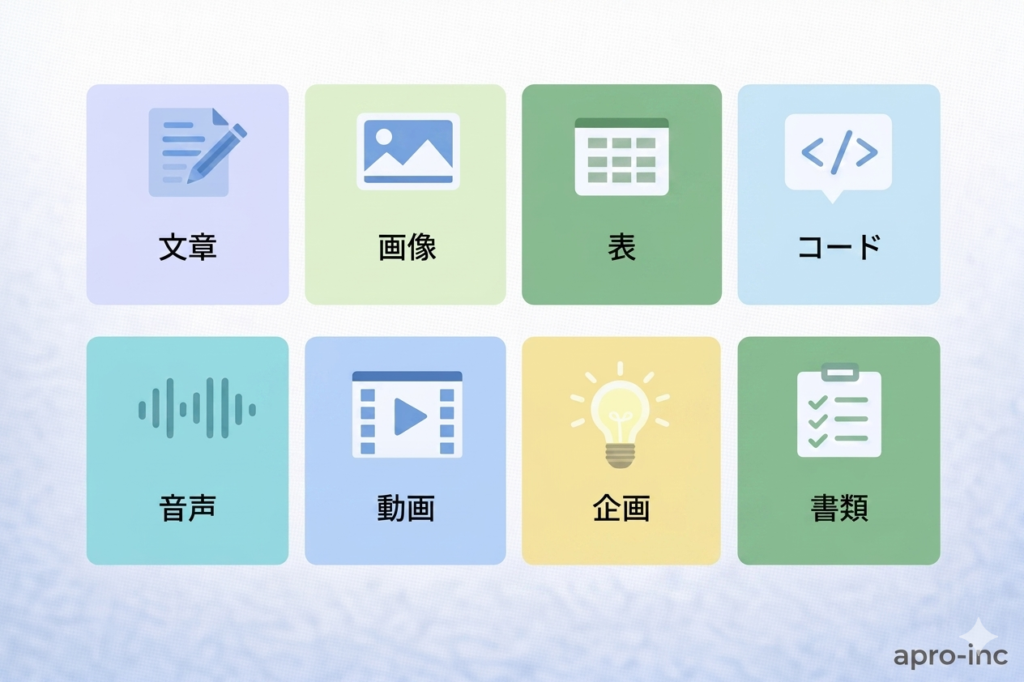 2026年現在、生成AIが生み出せるアウトプットは大きく8つのカテゴリに分類できます。以下の表で一気に整理しました。