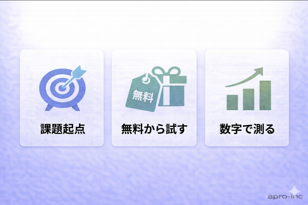 • 原則3「効果を数字で測る」:「導入前に週に何時間かかっていた作業が、導入後に何時間になったか」を記録する。この数字が次の投資判断と社内説得の根拠になります