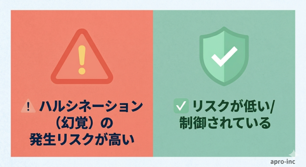 | ⚠️ ハルシネーションが起きやすい場面 | ✅ 起きにくい・抑制できる場面 |