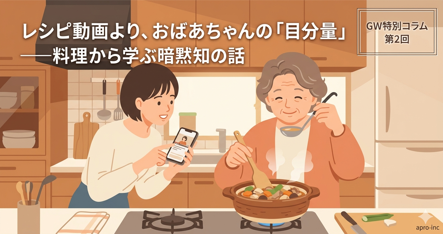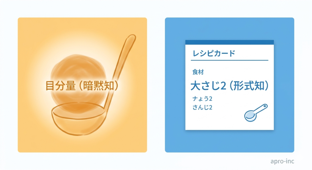 暗黙知とは、言葉や数字で表しにくい、個人の経験・感覚・勘の中に宿る知識のことです。おばあちゃんの「これくらい」は、何十年もの料理経験が手のひらに染み込んだ知識で、「大さじ2」という数字には変換できない何かがあります。