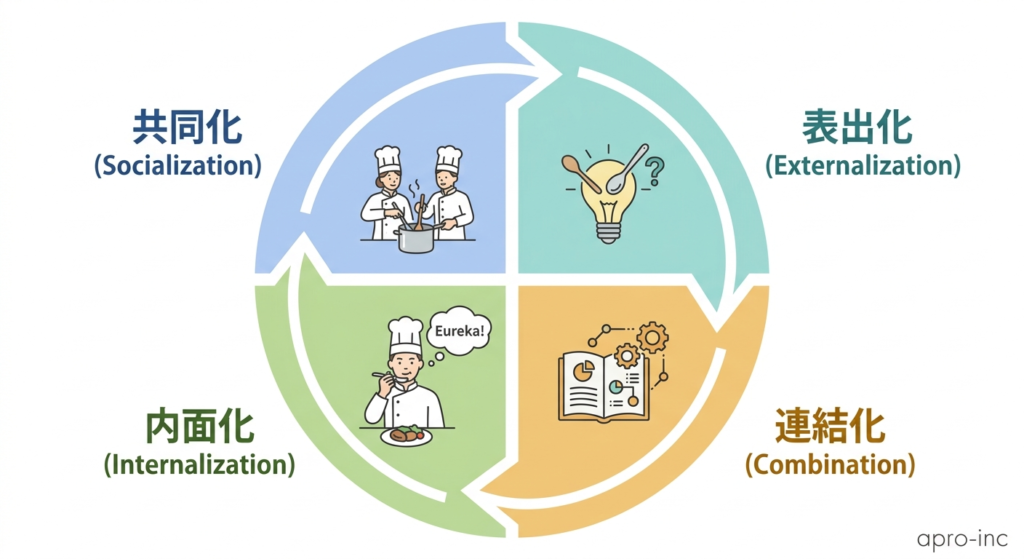 内面化(Internalization):形式知が体に染み込んで暗黙知になる。レシピを何度も作り続けるうちに「見なくてもわかる」感覚になること。