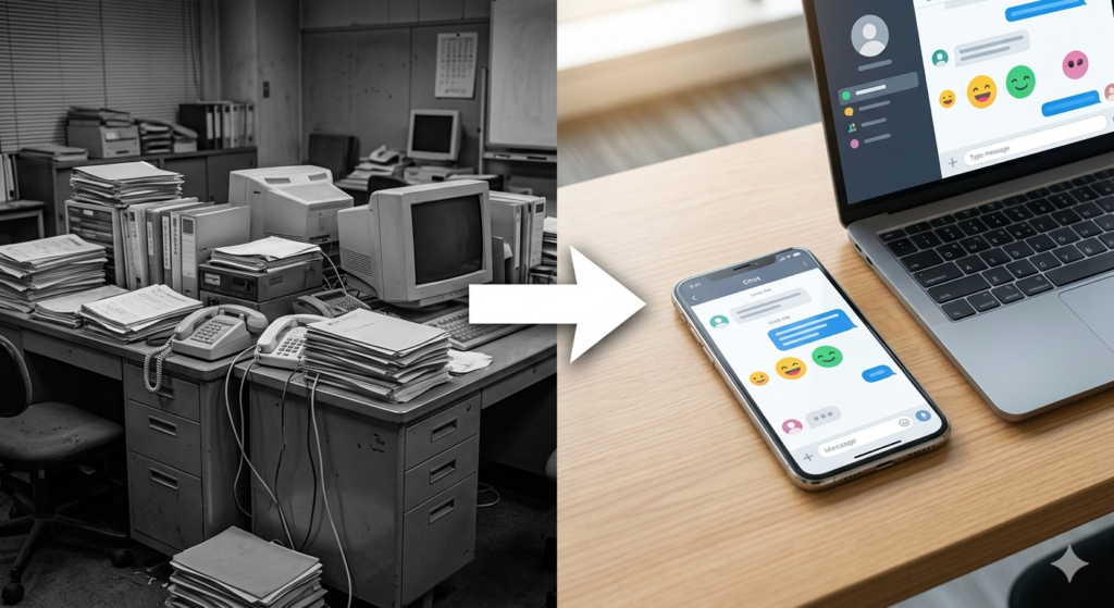 彼らが初日に目にするものが、複雑怪奇な紙の書類の山や、Windows XP時代から変わっていないような社内システム、あるいは「電話の取り方マニュアル」だけだとしたらどうでしょう?
