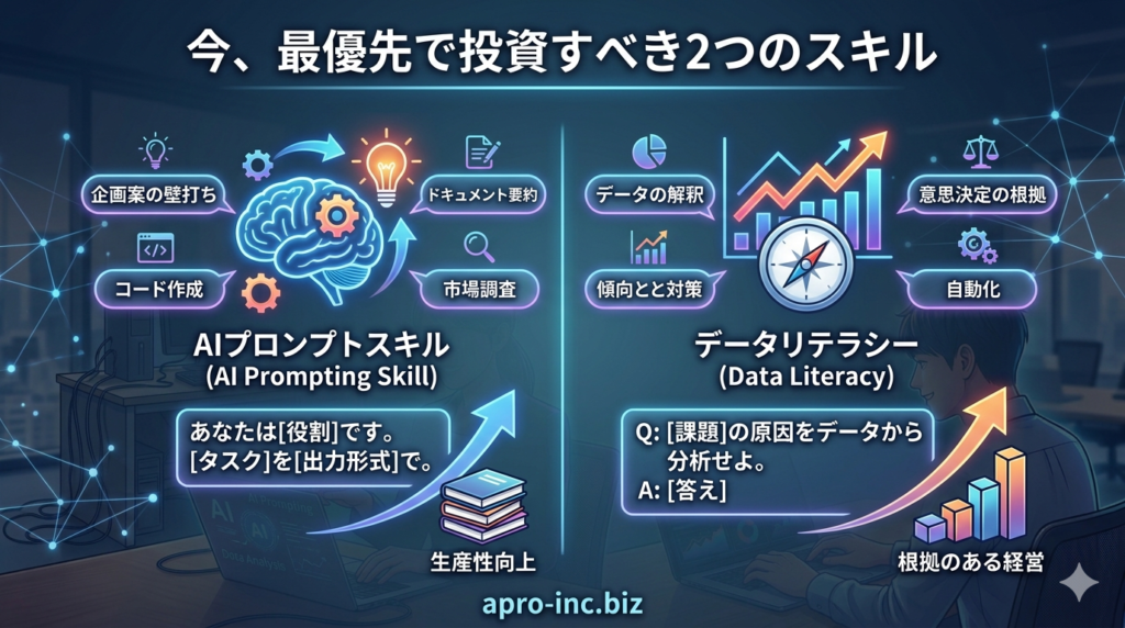 一方で、たとえ型落ちのPCであっても、使う人が生成AIを自在に操り、データ分析を自動化するスキルを持っていたら、その組織の生産性は数倍、数十倍に跳ね上がります。