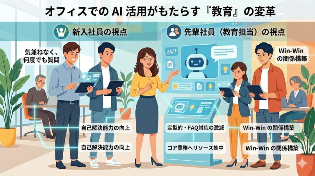 社内専用AIは、単なる効率化ツールではありません。新人は気兼ねなく成長でき、先輩は自分のキャリアやコア業務に集中できる。これこそが、令和の時代に求められる「Win-Winな教育DX」の形だと考えています。