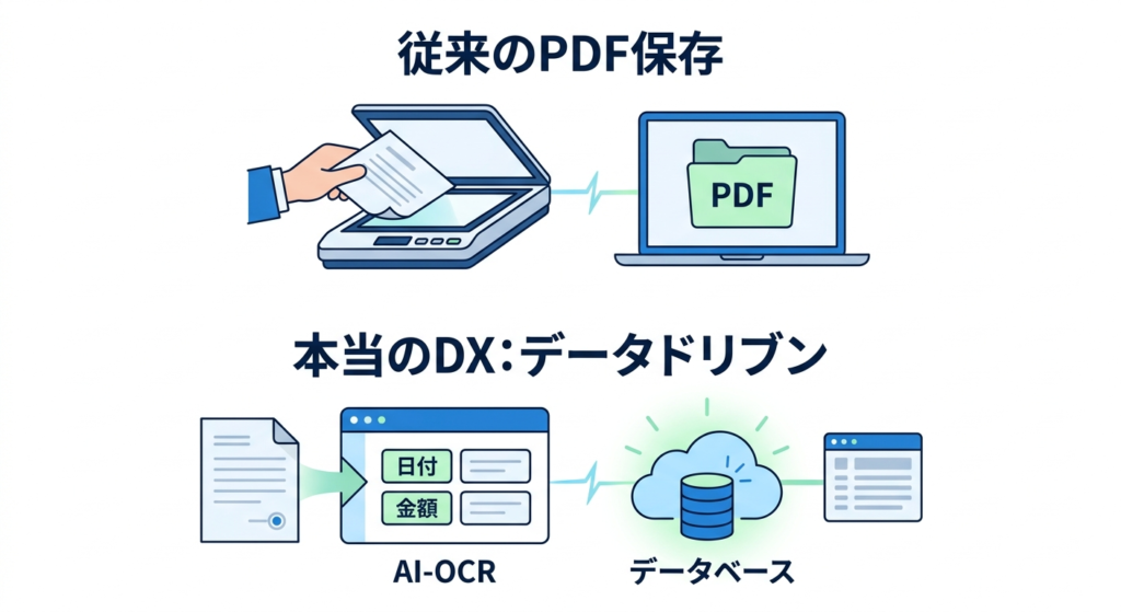 紙をPDFにする手間をかけるのではなく、最初からデジタルデータとして生成・流通させる「データ・ドリブン」な環境作りこそが、ペーパーレスの最終回答です(上図「本当のDX」参照)。